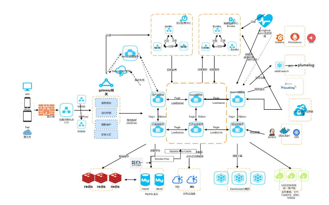 (5)数据存储主要包括Redis缓存、Mysql主从数据库、MQ消息中间件、ES存储、文件服务器等。